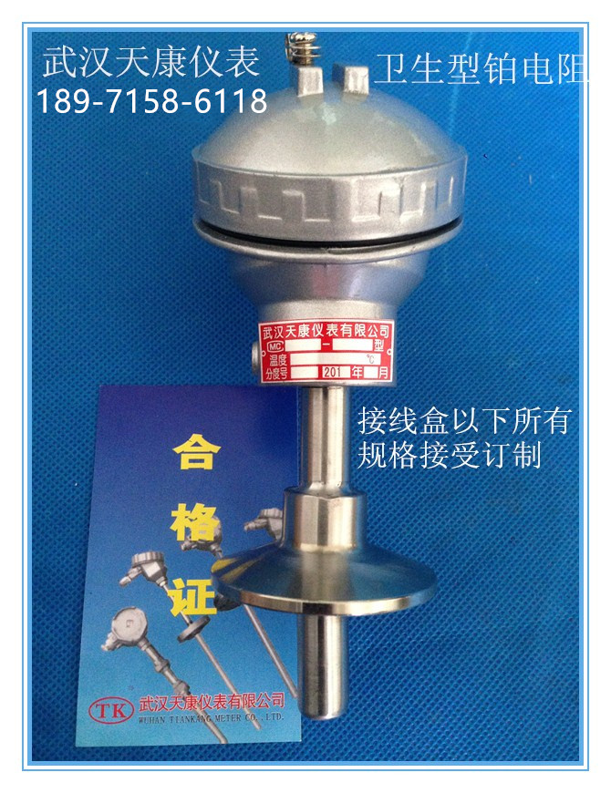 衛(wèi)生型鉑電阻 型號: TKWZPK-330W 品牌:武漢天康 分度號:Pt100 連接方式:衛(wèi)生法蘭(可選) 規(guī)格:L=100/50(可選) 保護(hù)管材質(zhì):304材質(zhì)(可選) 溫度范圍:-200-450℃ (可選)