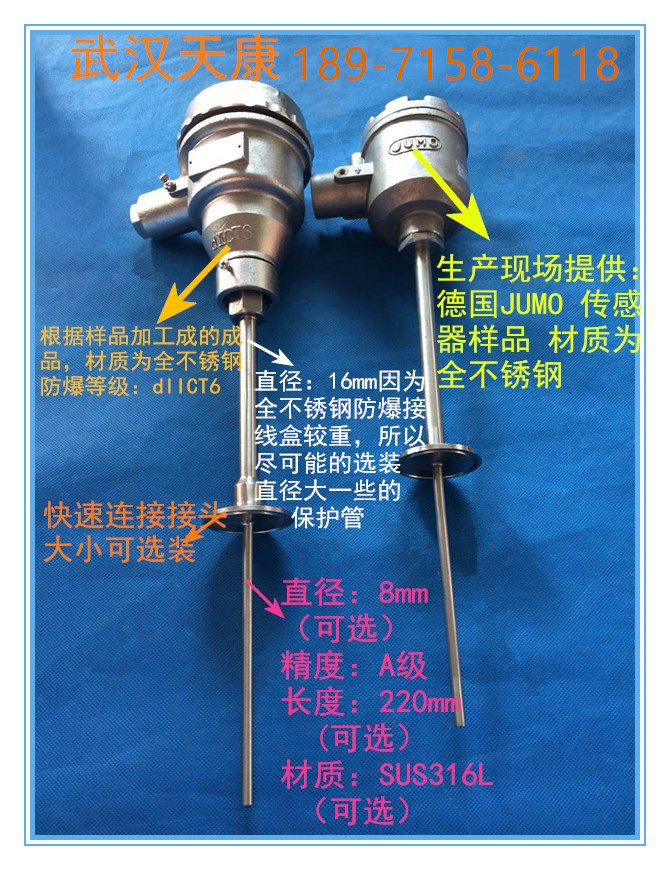 采用感溫元件 優(yōu)質(zhì)接線盒,優(yōu)質(zhì)不銹鋼保護(hù)管 型號:WZPK-448S 分度號:PT100 保護(hù)管長度:370/220 保護(hù)管直徑:16/8mm 安裝方式:快接法蘭 測溫范圍:-50-+400℃