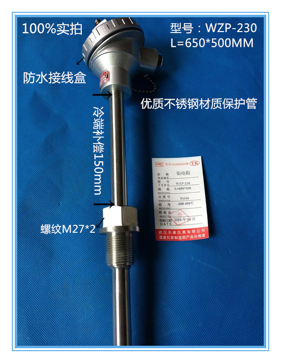 產(chǎn)品名稱:裝配式熱電阻 產(chǎn)品型號(hào):WZP-230 廠家:武漢天康儀表有限公司 規(guī)格:L=650/500mm 保護(hù)管直徑:16 保護(hù)管材質(zhì):304不銹鋼 分度號(hào):Pt100 (可以根據(jù)實(shí)際需要定做)