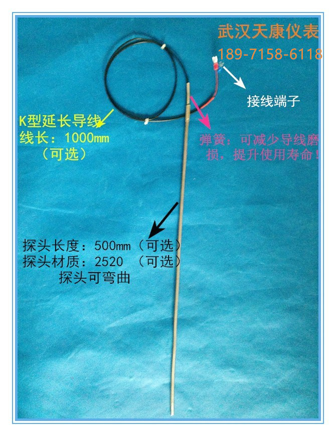 采用熱電偶測溫 探頭 分度號(hào): K 型號(hào): TKWRNK-196 探頭長度: 500mm 探頭直徑: 6*500*1000mm 保護(hù)管材質(zhì): 2520(1050℃)、可選高溫材質(zhì) 鐵氟龍屏蔽感溫線長: 1米 測溫范圍: 0-1050℃ 可訂制,詳情請(qǐng)聯(lián)系:189-7158-6118